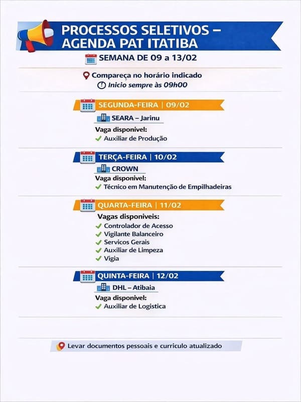 Processos Seletivos: Agenda do PAT de Itatiba, para Esta Semana